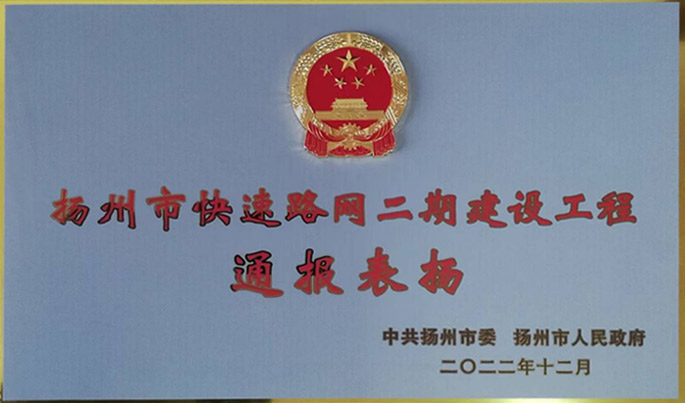 我公司承建的揚州江平東路快速化改造工程質(zhì)量、安全、進(jìn)度、精細(xì)化管理等各項指標(biāo)在揚州市快速路網(wǎng)二期工程同期各標(biāo)段中均名列前茅,受到中共揚州市委、揚州市人民政府通報表揚。